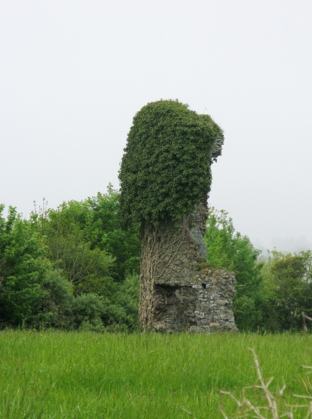 Le Petit moulin, enfin, ce qu'il en reste, au milieu d'un champ. Visible de la route. Sur la photo de gauche, on dirait qu'il a des yeux et une bouche.