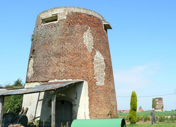 Deux anciens moulins tours en briques, très proches mais qui ne se situent pas sur les mêmes communes. Celui-ci est situé sur la commune de Boussières en Cambrésis et l'autre, sur la commune de Carnières en Cambrésis.