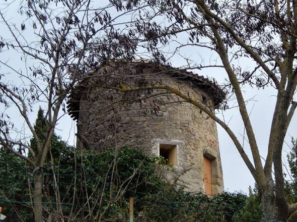 On peut apercevoir le fut de ce moulin en montant à la porte de la cité médiévale.