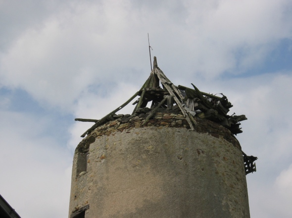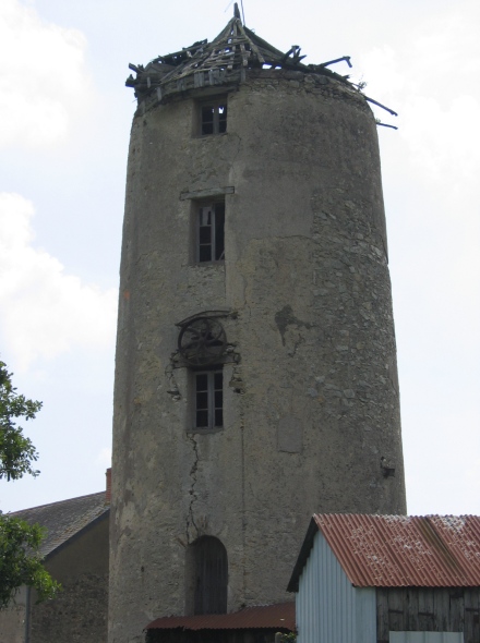 Ancien moulin tour désaffecté dont la toiture est totalement ruinée.