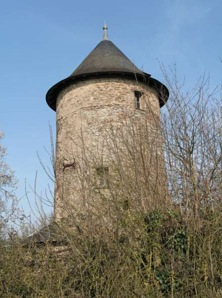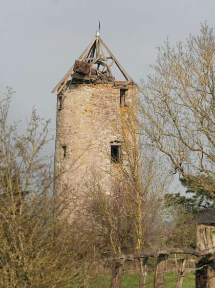 Moulin de la grande vigne Ancien moulin tour dont le toit est complètement détruit. Une partie du mécanisme est encore visible du haut de la tour. (Photos Daniel Trouillard - 1er avril 2013)