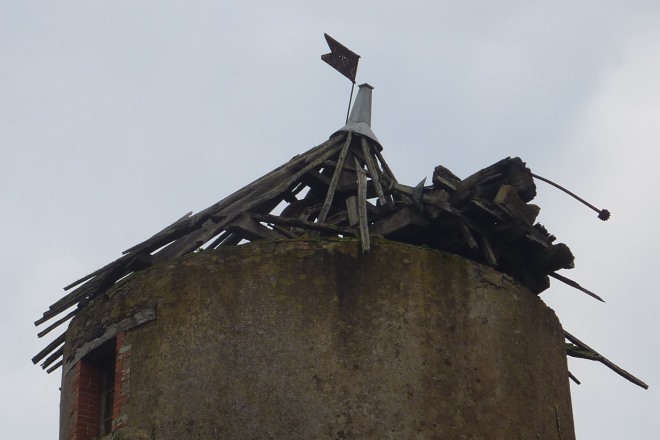 Ancien moulin tour complètement abandonné. Le toit s'effondre, des ailes Berton sont tombées au sol.