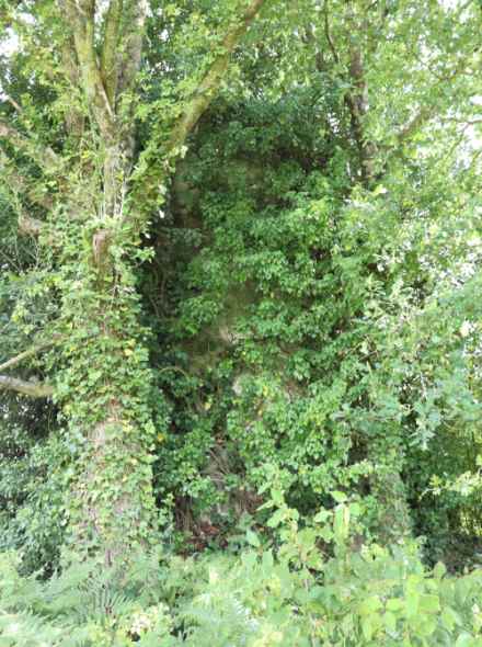 Ancien moulin tour à l'état de ruine dans un bosquet, recouvert de végétation.