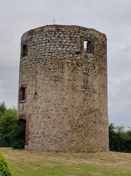 Ce moulin tour est situé dans le jardin d'une propriété privée dont le propriétaire a très aimablement autorisé Laurent à prendre quelques photos. Il y a quelques temps, le moulin possédait encore 2 ailes. Le propriétaire a installé une statue de la Vierge sur la tour. La date de construction - 1872 - figure au dessus d'une porte.