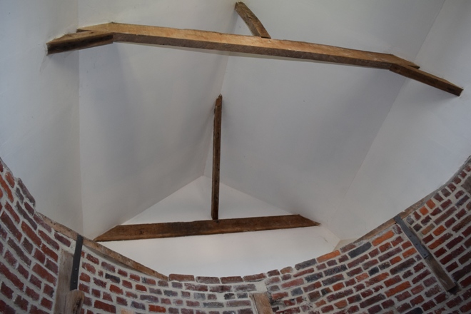 Un beau toit a été installé au fait de la tour mais je doute qu'il tourne un jour car la gouttière est fixée à la tour !
